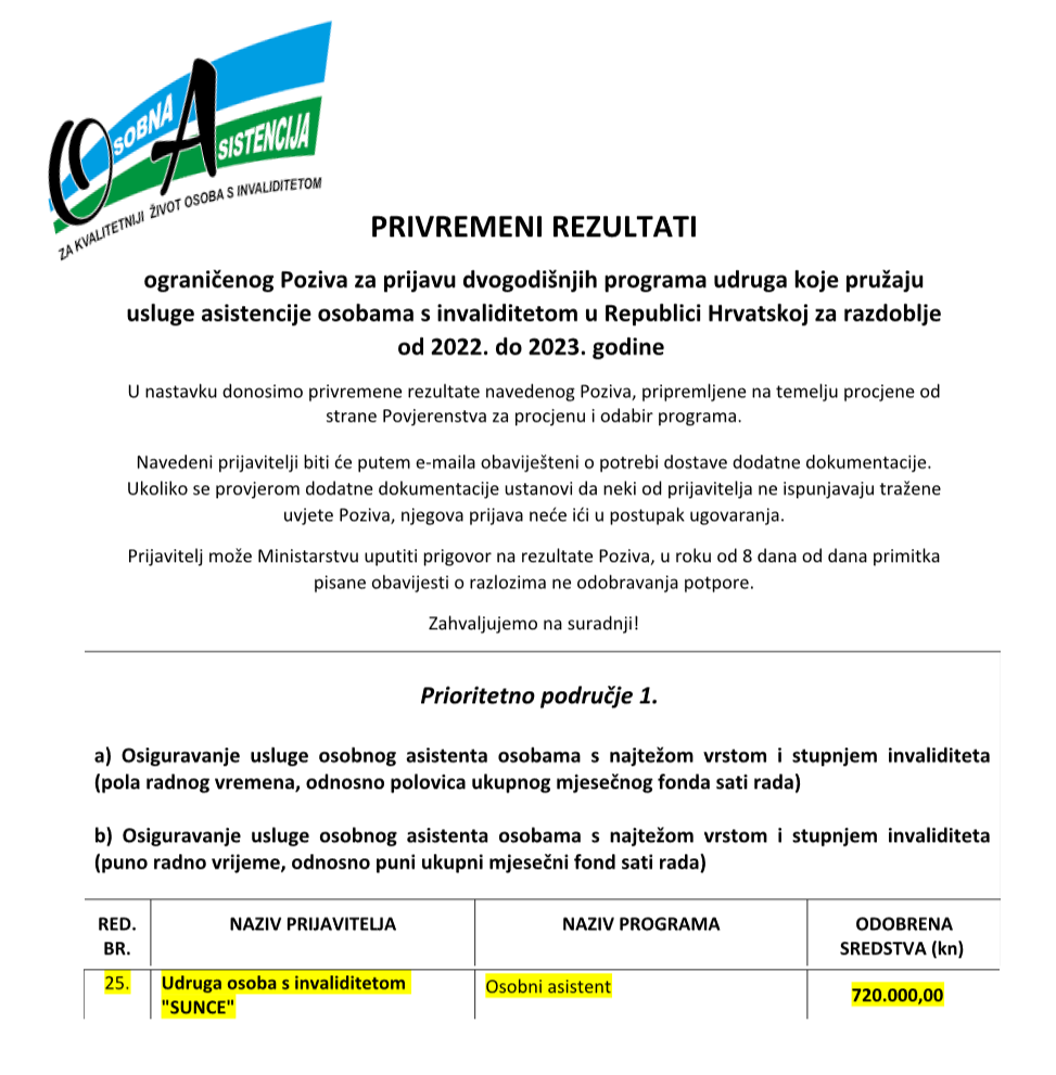 Odobren je i našoj Udruzi novi projekt pružanju osobne asistencije za slijedeće 2 godine u vrijednosti od 720.000,00 kn a to znači nastavak za naših 14 dugogodišnjih korisnika, odobrenje za 1 novog korisnika i nastavak posla za 11 osobnih asistenata.