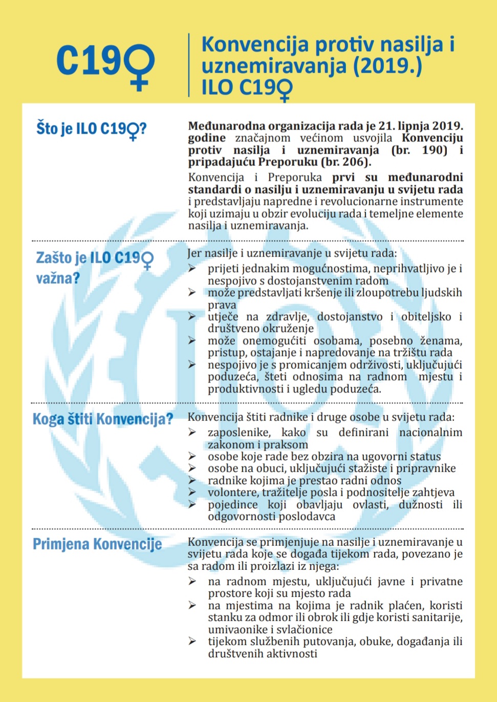 Konvencija ima za cilj regulirati i zabraniti nasilje i uznemiravanje u svijetu rada, uključujući i rodno uvjetovano nasilje, a koje se događa tijekom rada, povezano je sa radom ili proizlazi iz njega, osiguratiodgovarajuće mjere za prevenciju nasilja i uznemiravanja u svijetu rada te mjere nadzora i sankcija.